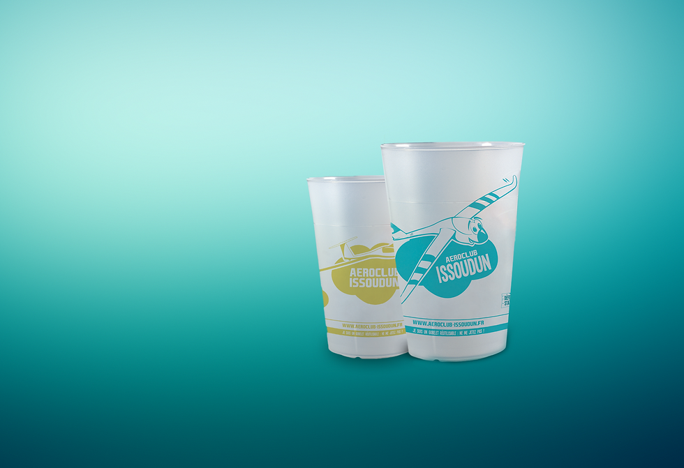 L'Aéroclub disposant d'un bar*, notre studio a imaginé la conception et la fabrication de gobelets publicitaires. Eco-responsables, nos gobelets sont 100 % réutilisables. Notre annonceur a choisi la taille de ses gobelets, le Pantone de son marquage, et notre agence a réalisé plusieurs visuels, du cartoon à l'institutionnel.
